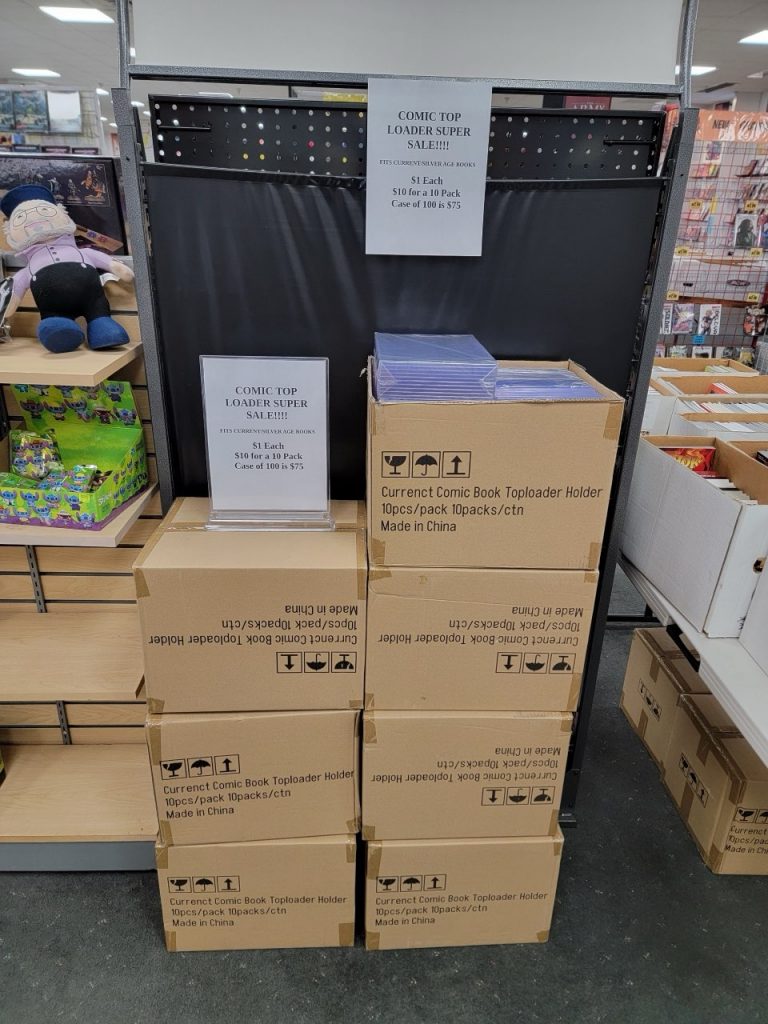 We have some amazing deals on current/silverage sized toploaders right now. For a limited time you can get them for $1 each for a single, a 10 pack for $10 or a case of 100 for just $75! They fit current and silverage bagged and boarded books! Available in all stores now!